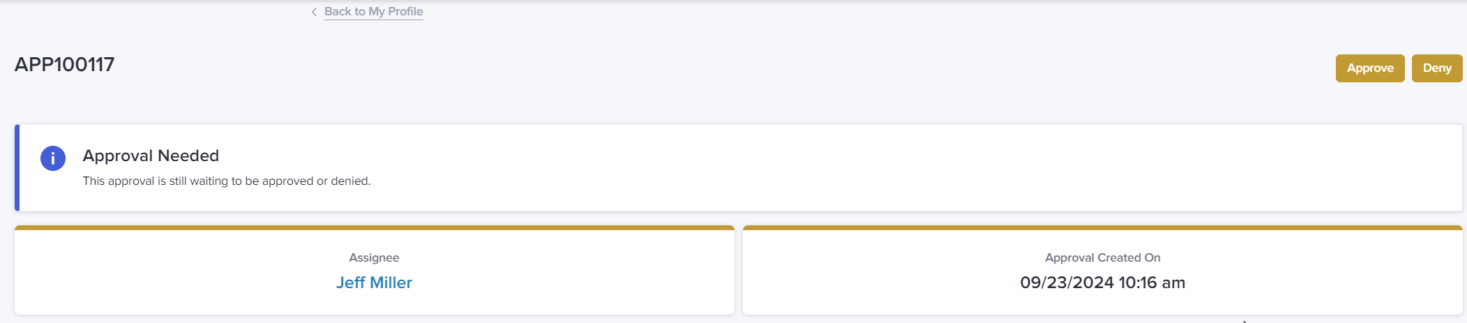 Green-level supervisors and up will see an Approvals tab in My Profile, which is where they will see all approval requests that they are responsible for addressing. When a decision has been made, simply select Approve or Deny in the top right corner of the approval request and the requester of the asset will be notified accordingly.