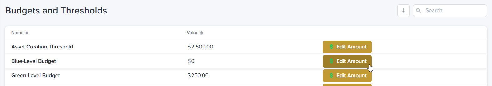 Also in App Settings is the Budgets and Thresholds section. This is where you have the ability to change budget amounts, as well as the dollar threshold for when assets get created. It is not necessary to navigate inside the record for these settings, just select the Edit Amount button to change the amount.