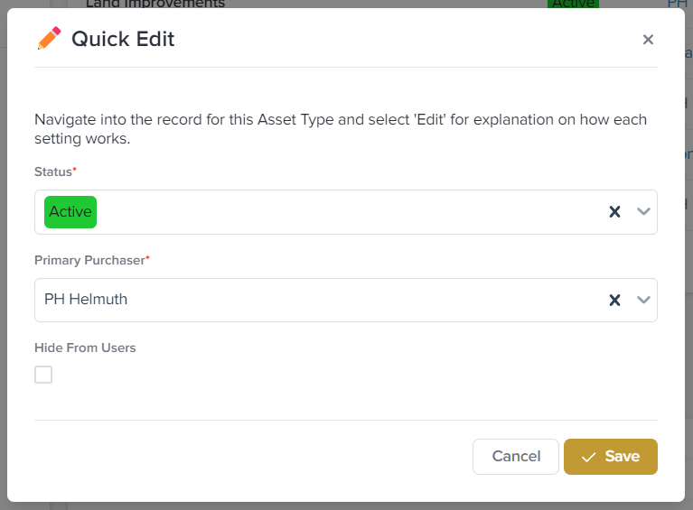Every new asset type created will default to the Active status. In the case of an asset type no longer being used, the status can be changed from Active to Inactive. This will ensure assets we still have with that asset type can still be viewed in the portal, while preventing new assets from receiving that type.