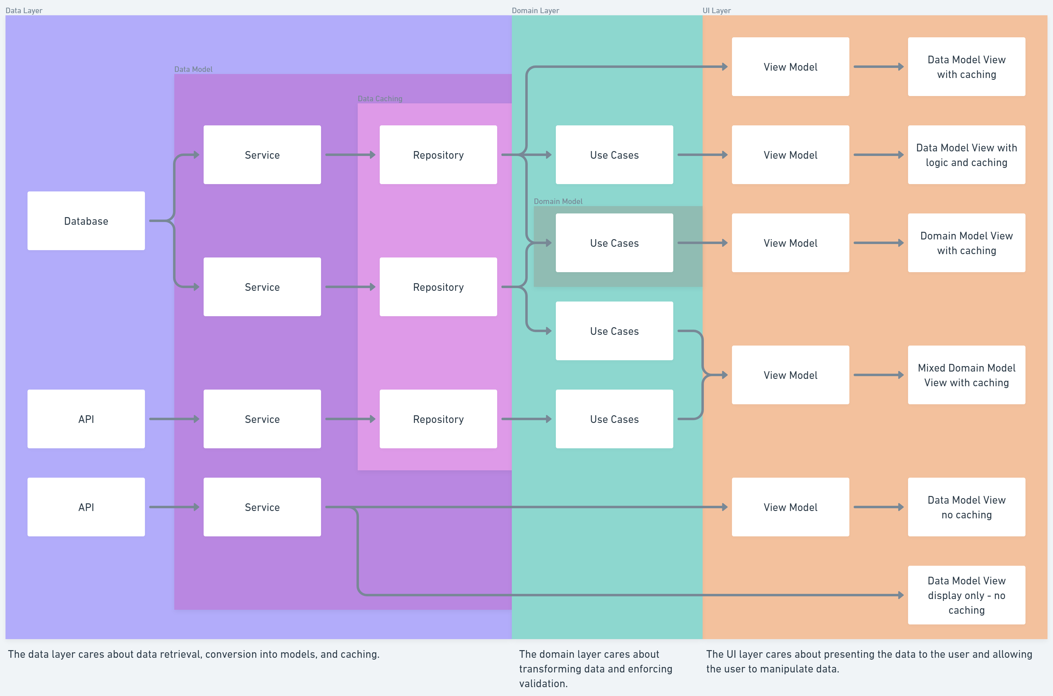 Services → usually consumed by Repositories and Controllers, can be consumed by View Models directly when data caching and validation is not needed.