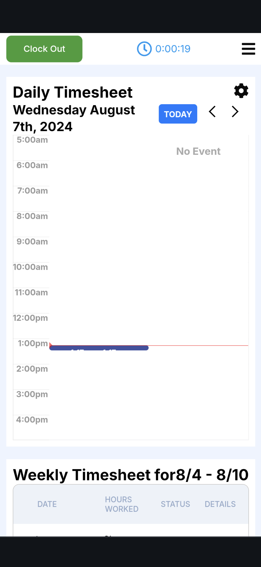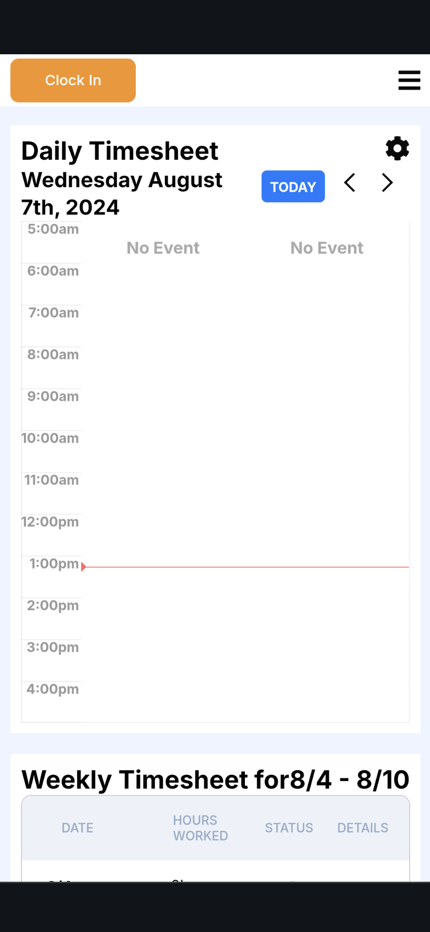 Once logged into your account, you will see a prominent button at the top of your screen saying, "Clock In". Select it to clock in.
