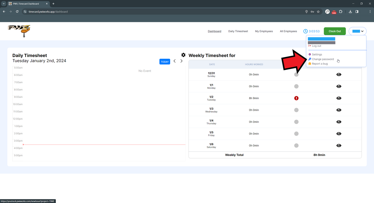 Find your name in the top-right corner and click the drop-down arrow, then select Change Password.